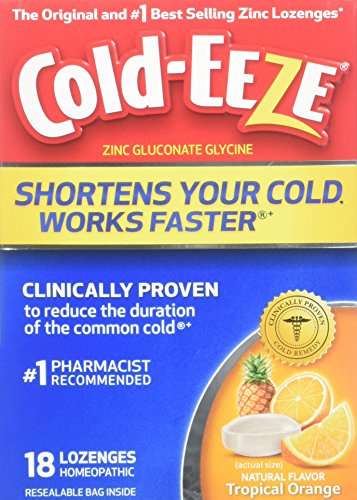 • Contains (1) box of (18) Cold-EEZE Cold Remedy Lozenges, Tropical Orange flavor. Cold-EEZE Tropical Orange Cold Remedy Lozenges are formulated with zinc gluconate & have been clinically proven to reduce the length of the common cold by almost half.